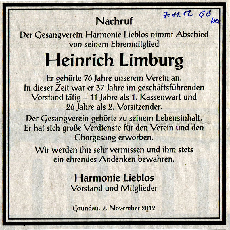 Eine große Anzahl von Mitgliedern fand sich auf dem Friedhof in Lieblos ein, um das Ehrenmitglied Heinrich Limburg auf seinem letzten Weg zu begleiten. Als Fahnenträger fungierte Heinrich Bechtold.