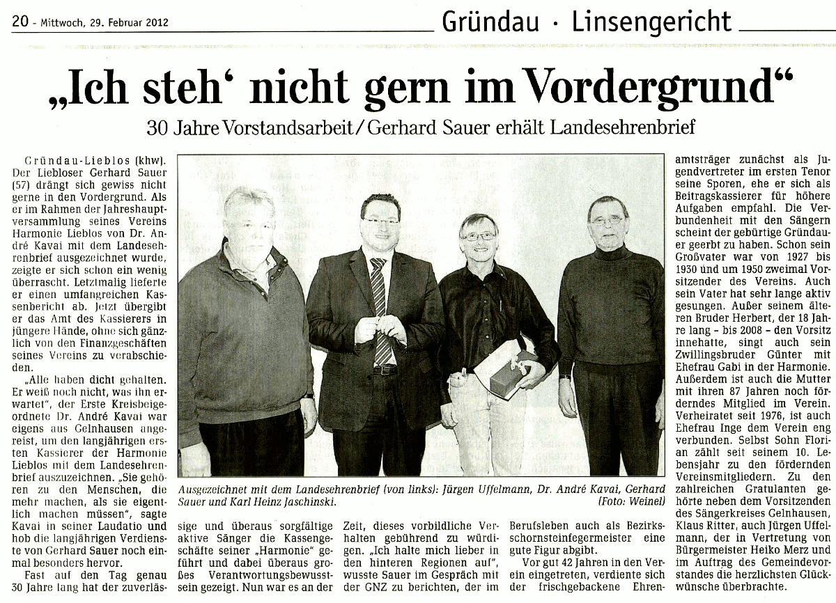 Ehrenbrief des Landes Hessen für Gerhard Sauer