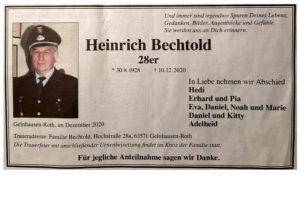 Heinrich Bechtold, auch bekannt unter „de 28er“, war immer – solange es seine Gesundheit ermöglichte – ein interessierter Besucher unserer Konzerte und Versammlungen. Sein Lebenslicht ist erloschen, aber die Erinnerungen an Heinrich bleiben lebendig.