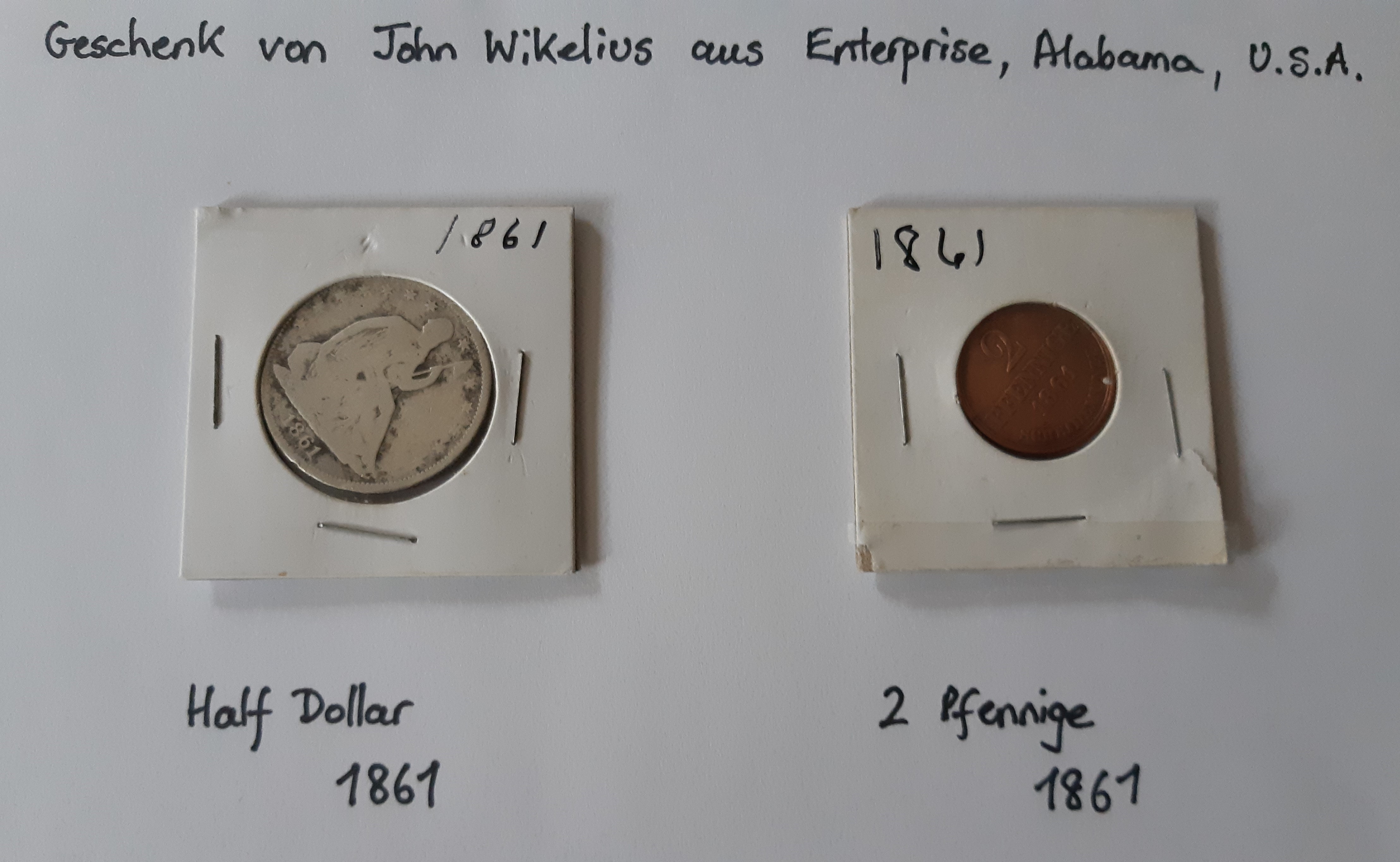 Unser langjähriger Freund John Wikelius aus Enterprise, Alabama, USA hat uns ein besonderes Geschenk gesendet. Es handelt sich um 2 historische Münzen aus unserem Gründungsjahr 1861. Wir werden sie auch nächstes Jahr bei unserer 160-Jahr-Feier ausstellen.