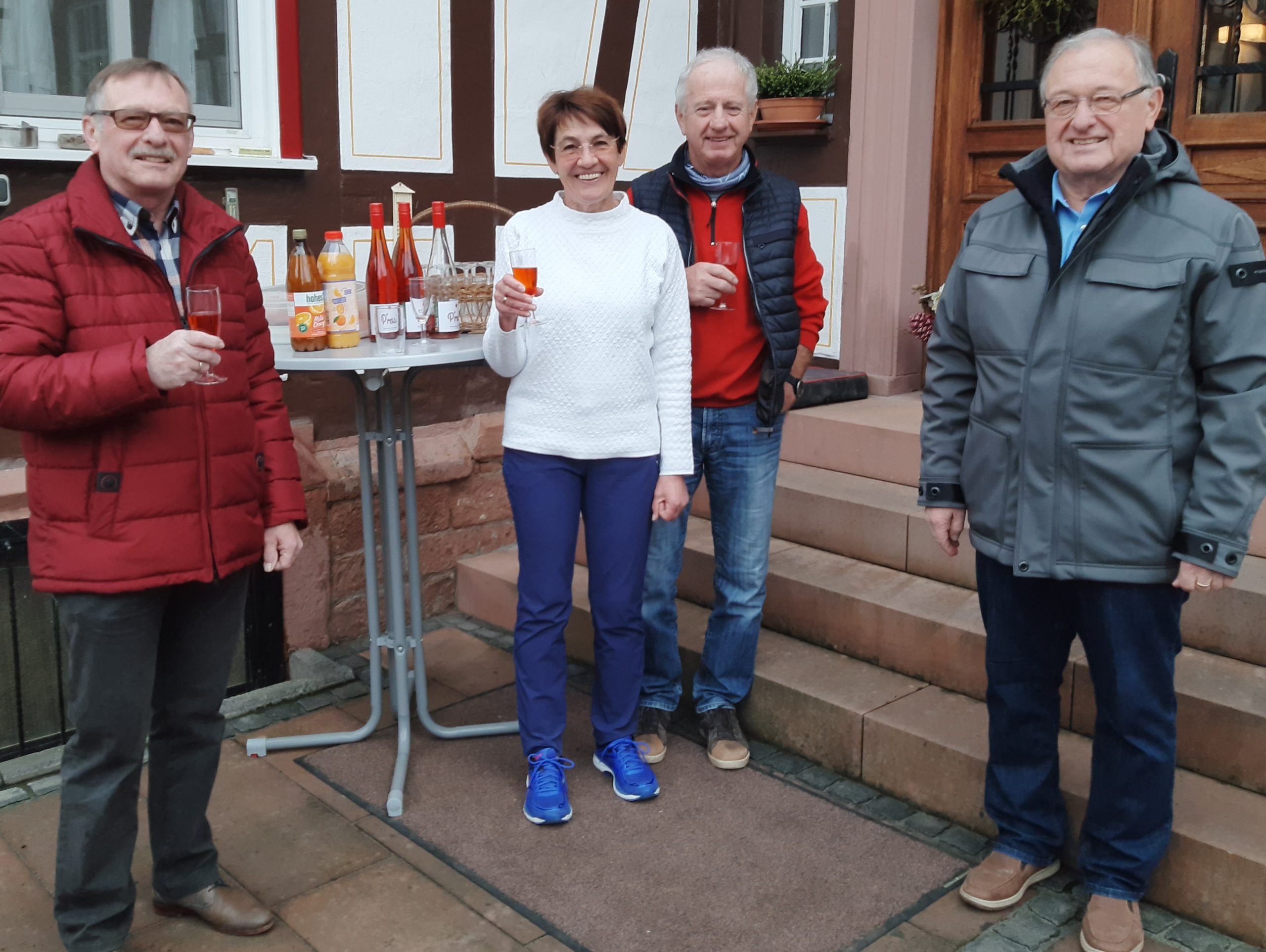 Die Mitbegründerin des Gemischten Chores feiert ihren 70 Geburtstag. Im Hof des Anwesens von Bauer Würfl gratulieren Gerhard und Herbert Sauer für die Harmonie und überreichen einen Präsentkorb.
