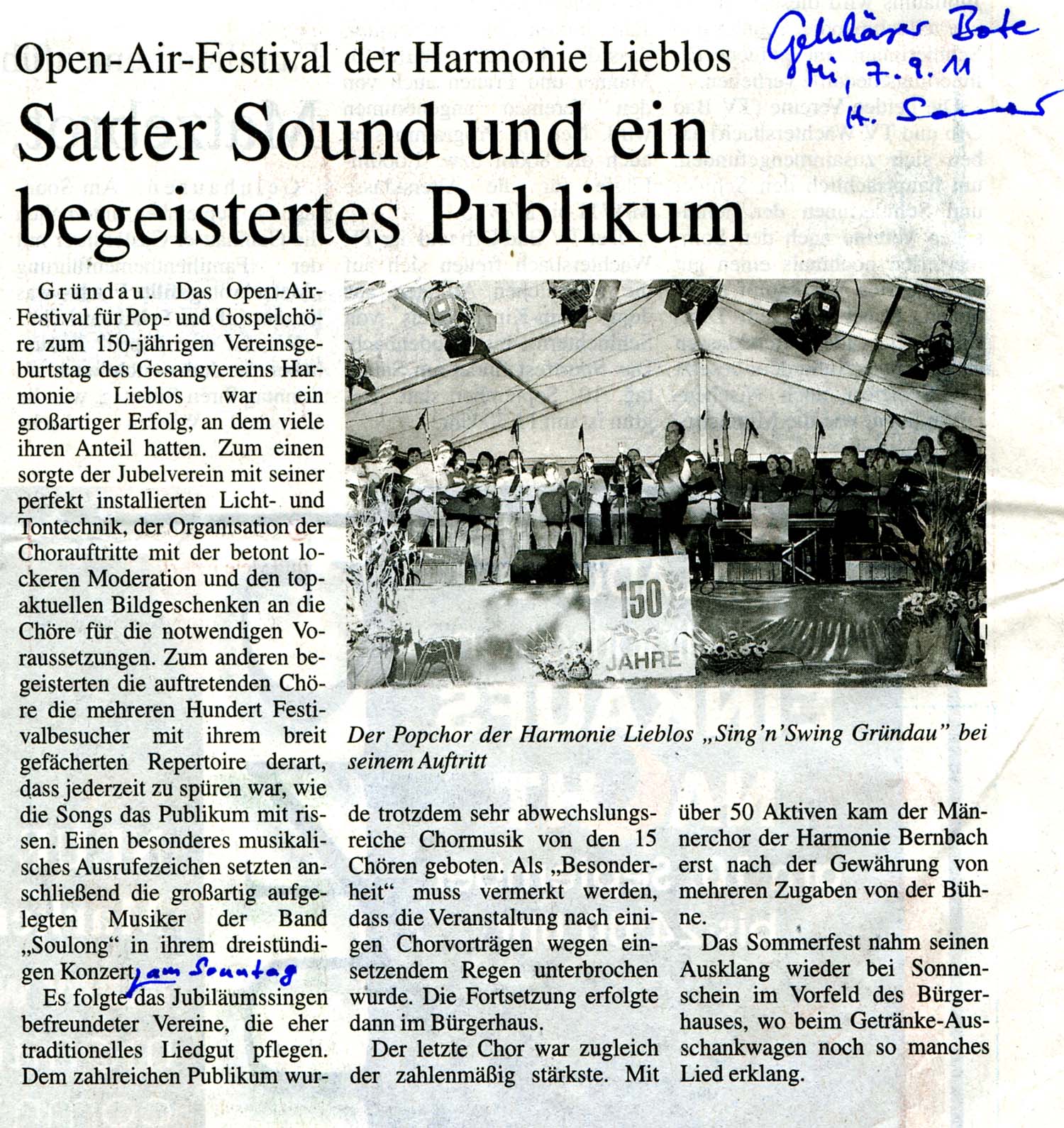 Parkanlage vor dem Harmonieheim ihre Auftritte absolvieren. Eröffnet wurde die Veranstaltung von der Sparte Sing’n’Swing unter Peter Grimm mit einem Medley an Musical-Melodien von Andrew Lloyd Webber. Alle Gruppen entführten die Zuhörer in die Welt der Pop- und Gospelkunst und verstanden es, Gäste und Fans aus der Reserve zu locken und zu begeistern. Es entwickelte sich ein stimmungsvoller Musikabend, der die Zuhörer zum Schunkeln und Mitmachen animierte. Die Vorträge wurden wiederholt frenetisch gefeiert. Nach dem 3-stündigen Konzert übernahm die Soul- und Rockband Soulong das Zepter und überzeugte die Zuhörer aller Altersklassen bis nach Mitternacht.
