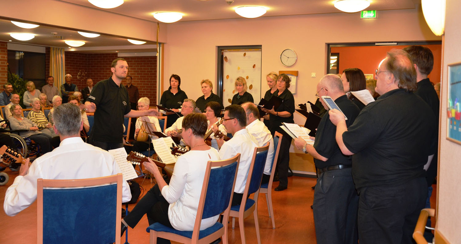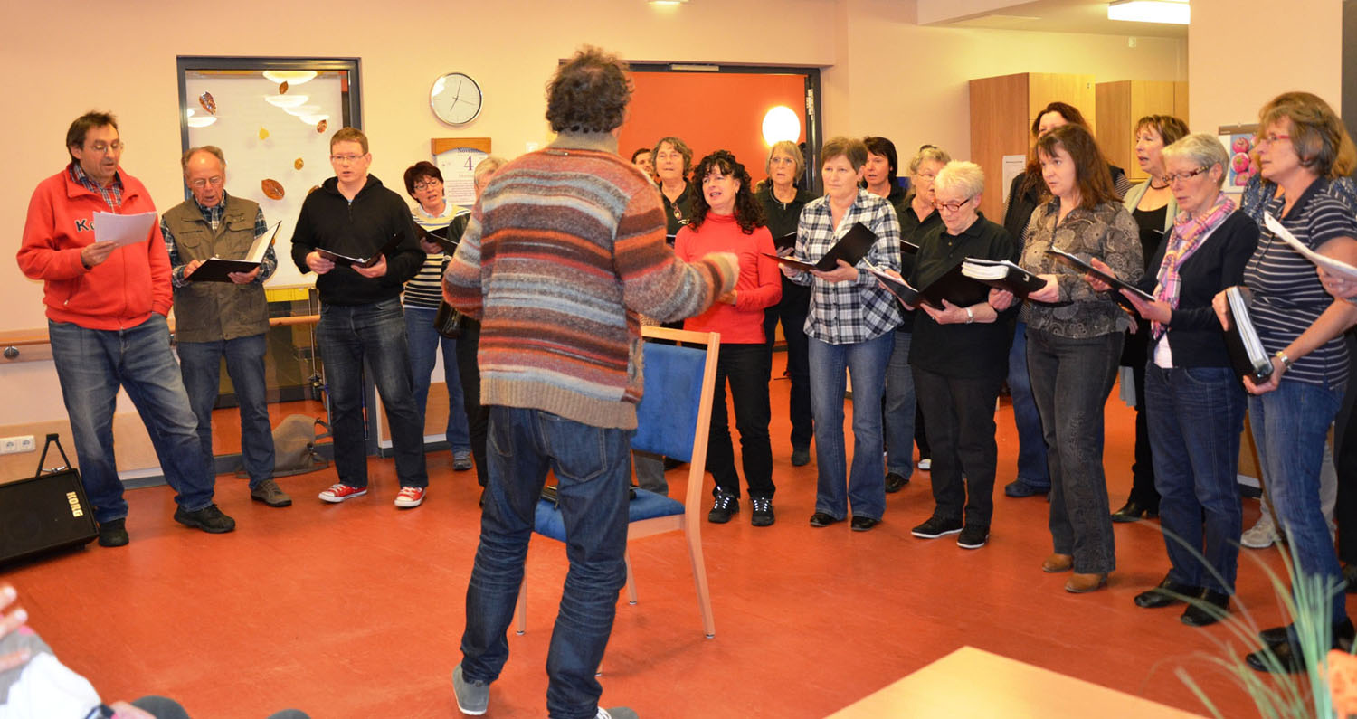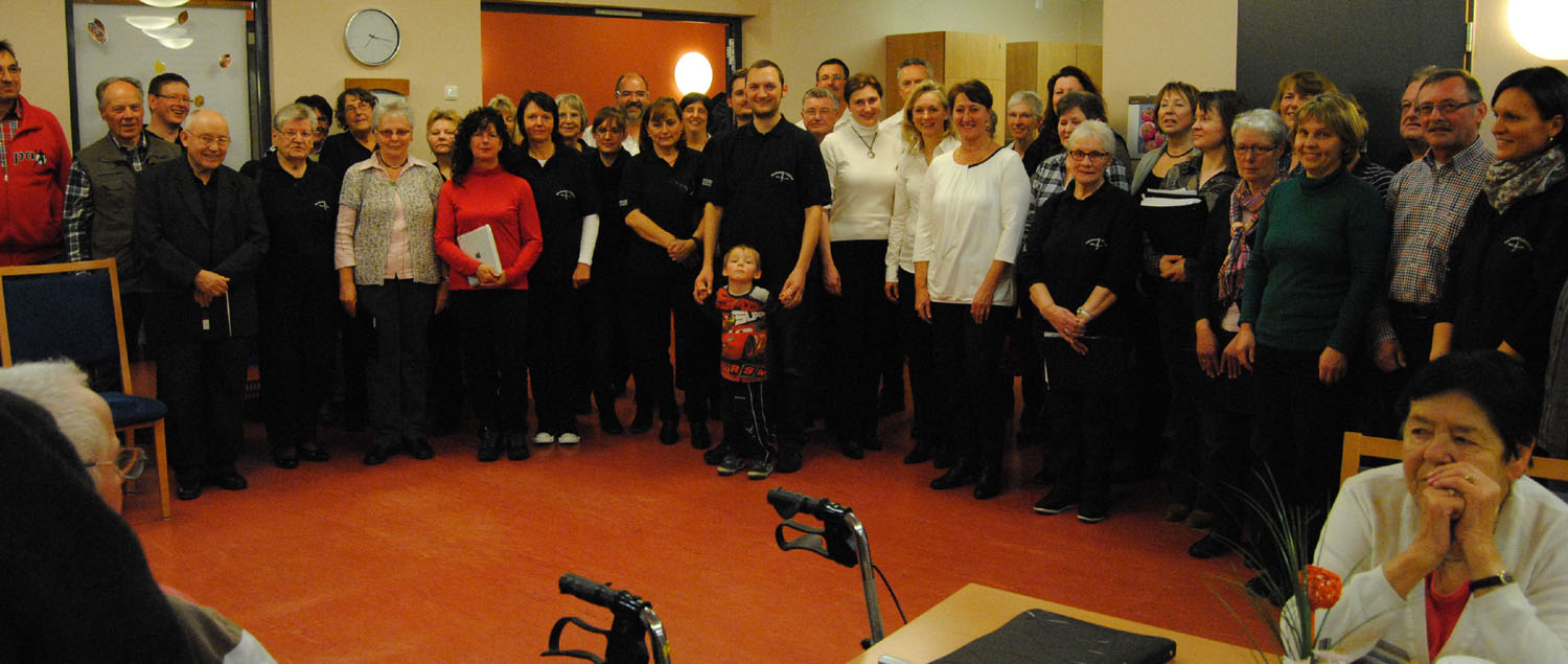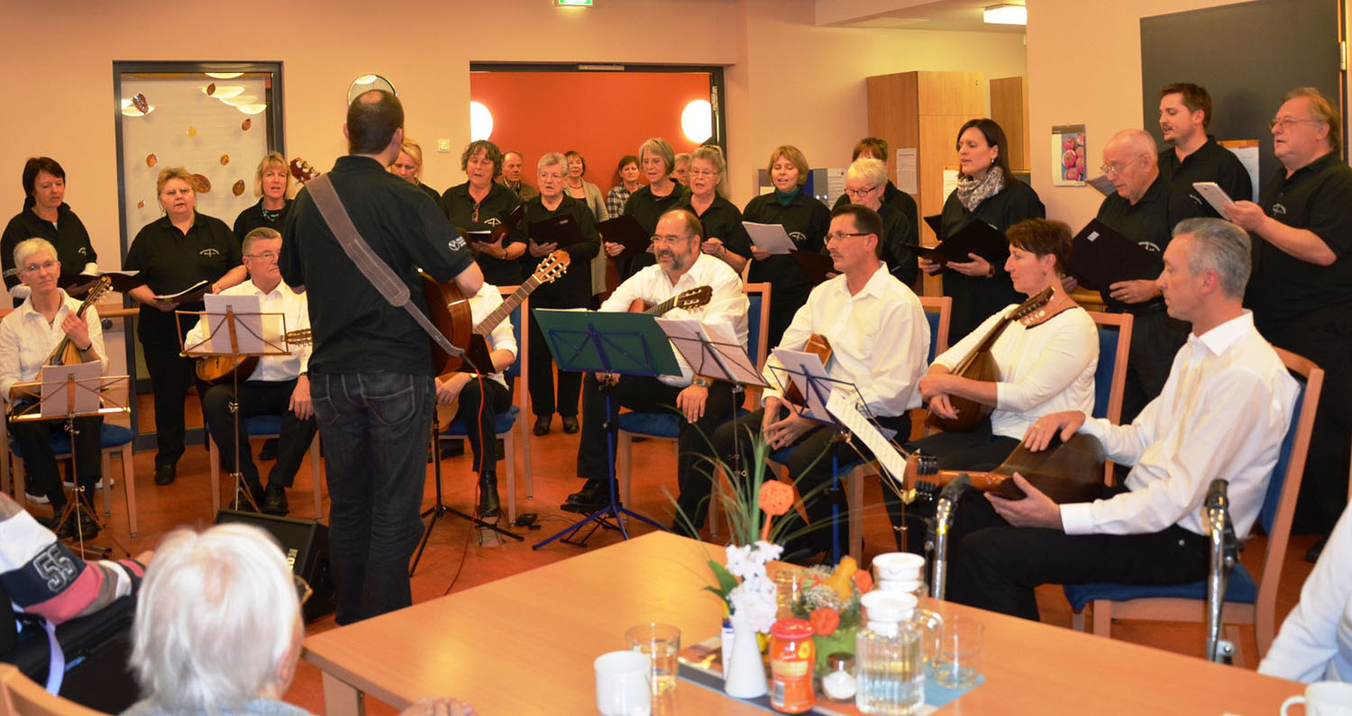 Heute waren gleich mehrere Gruppen aktiv, um den betagten Menschen im Seniorenzentrum mit einigen Vorträgen etwas Kurzweil zu bieten. Vor dem von Peter Grimm dirigierten „Gemischten Chor“, der mit „Weit, weit weg“, „Über’m See“ und dem „Halleluja“ einen fulminanten Abschluss bot, fand der Premierenauftritt des vor wenigen Monaten neu gegründeten „Volxchores“ große Beachtung. Die Aktiven, die sich aus Musikern des „Vereins für Volksmusik“ und aus Sängerinnen und Sängern der „Harmonie“ zusammensetzen, werden von Michael Hampel geleitet. Sie konnten mit „Sag mir wo die Blumen sind“, „Griechischer Wein“ und „Gute Nacht Freunde“ auf Anhieb überzeugen. Vorher stimmten die Musikerinnen und Musiker des VfV mit einigen Liedern das dankbare Publikum auf die sich anschließenden Vorträge ein.