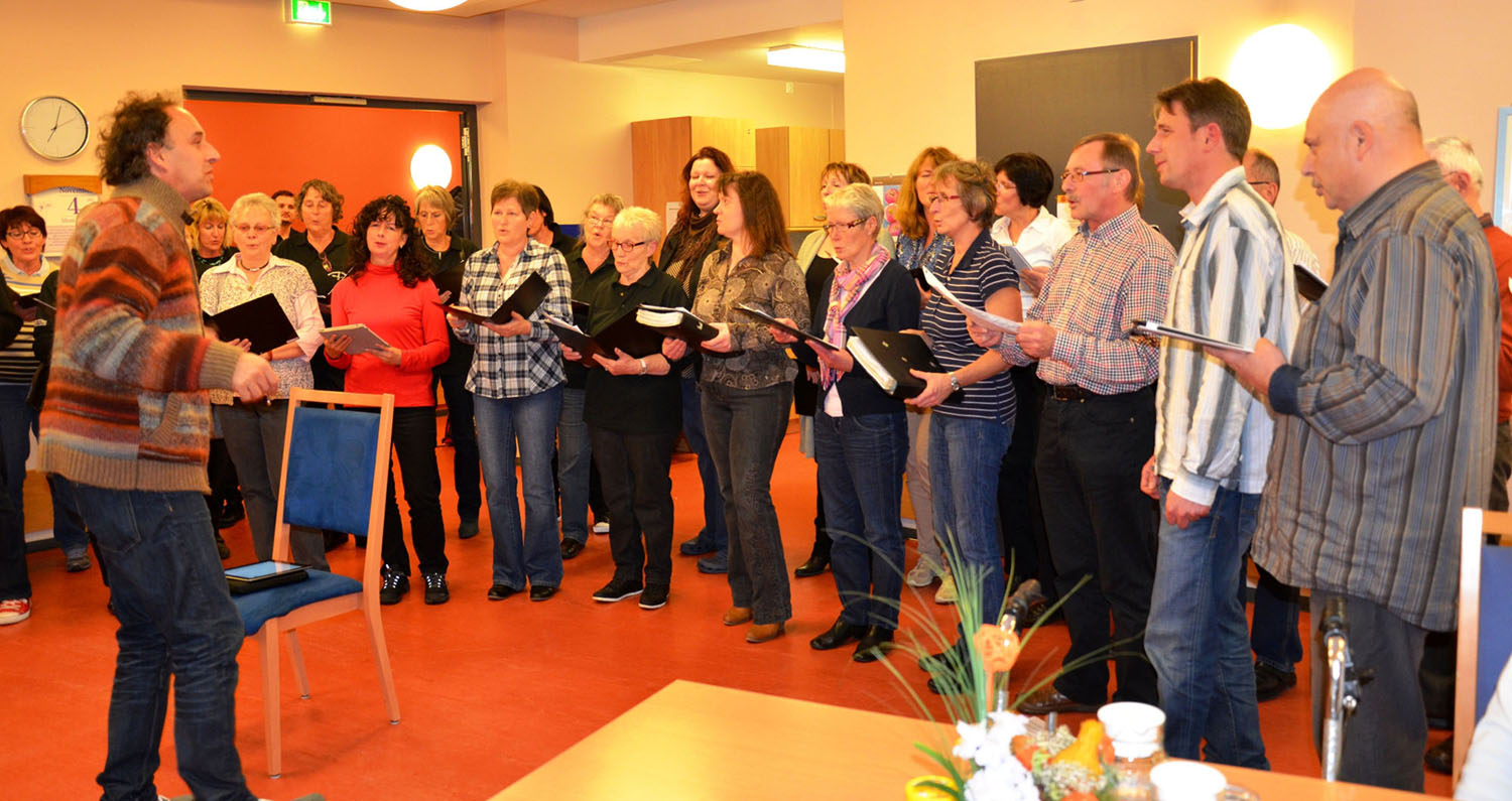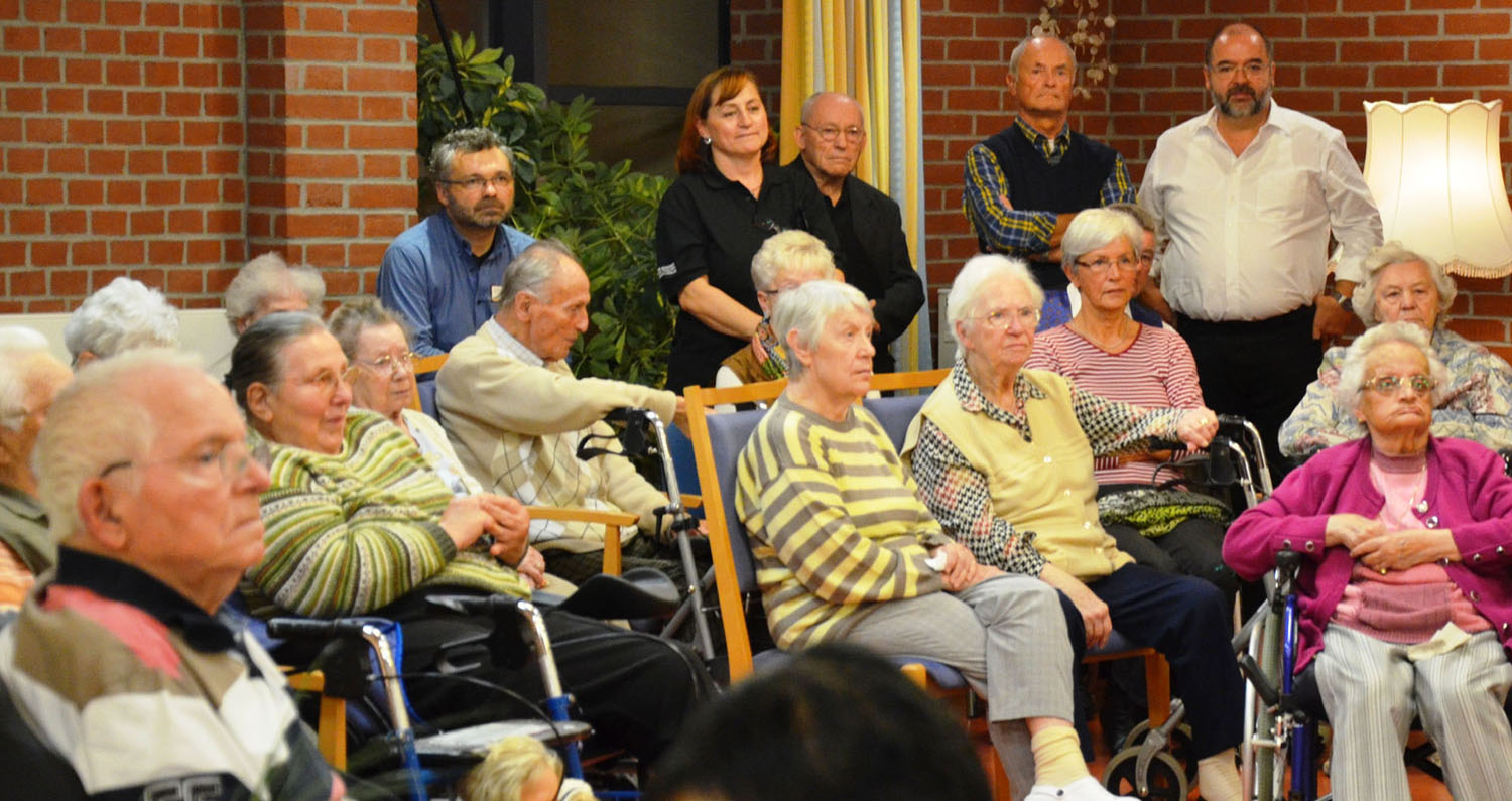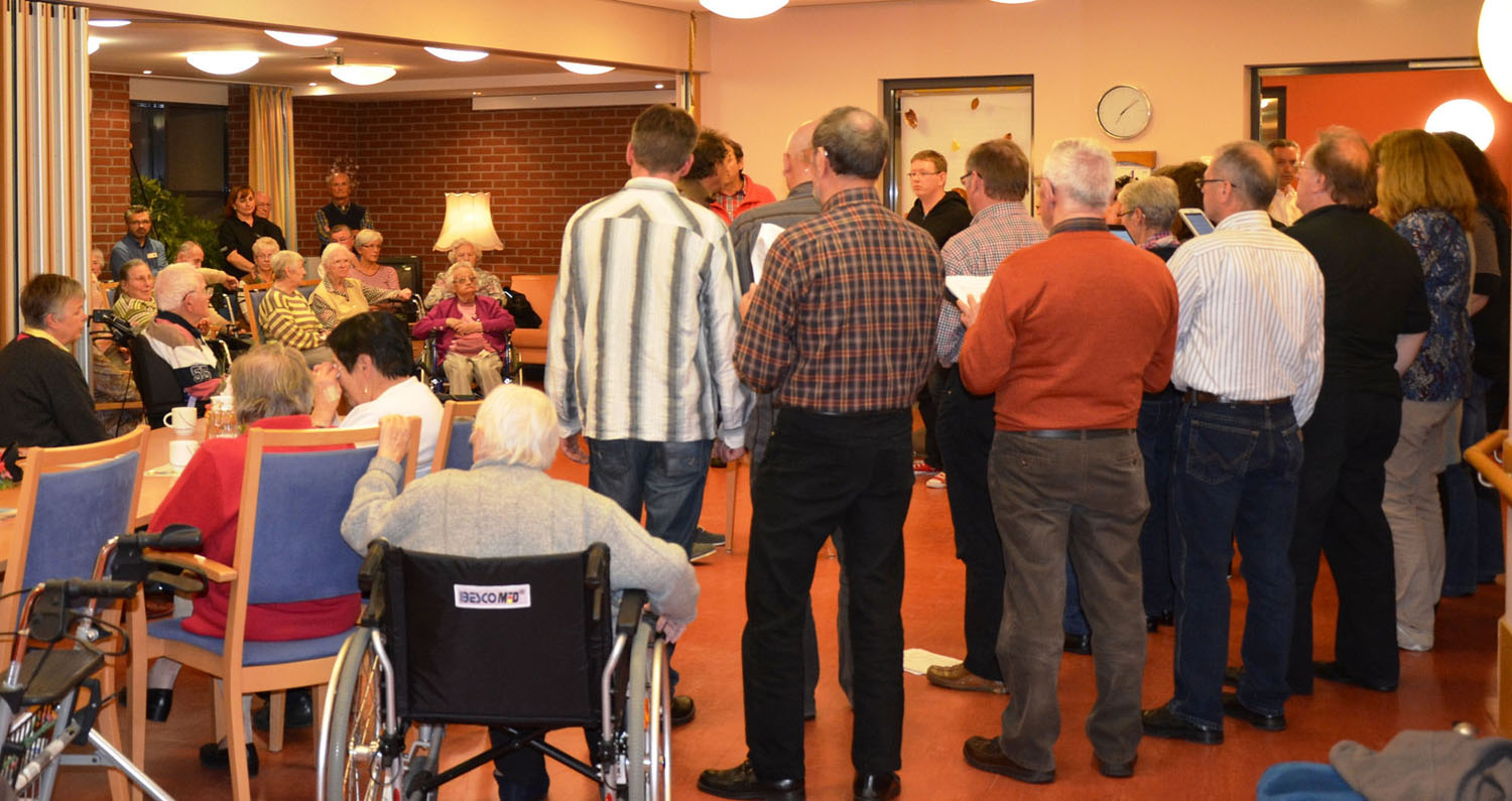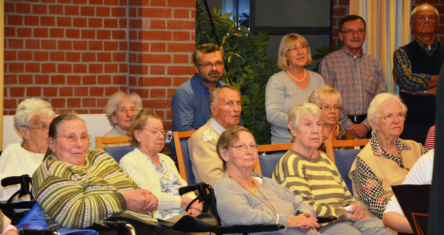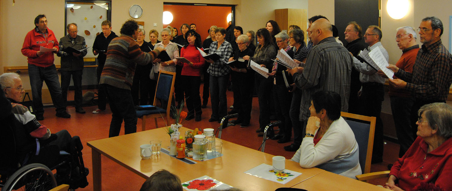 Heute waren gleich mehrere Gruppen aktiv, um den betagten Menschen im Seniorenzentrum mit einigen Vorträgen etwas Kurzweil zu bieten. Vor dem von Peter Grimm dirigierten „Gemischten Chor“, der mit „Weit, weit weg“, „Über’m See“ und dem „Halleluja“ einen fulminanten Abschluss bot, fand der Premierenauftritt des vor wenigen Monaten neu gegründeten „Volxchores“ große Beachtung. Die Aktiven, die sich aus Musikern des „Vereins für Volksmusik“ und aus Sängerinnen und Sängern der „Harmonie“ zusammensetzen, werden von Michael Hampel geleitet. Sie konnten mit „Sag mir wo die Blumen sind“, „Griechischer Wein“ und „Gute Nacht Freunde“ auf Anhieb überzeugen. Vorher stimmten die Musikerinnen und Musiker des VfV mit einigen Liedern das dankbare Publikum auf die sich anschließenden Vorträge ein.