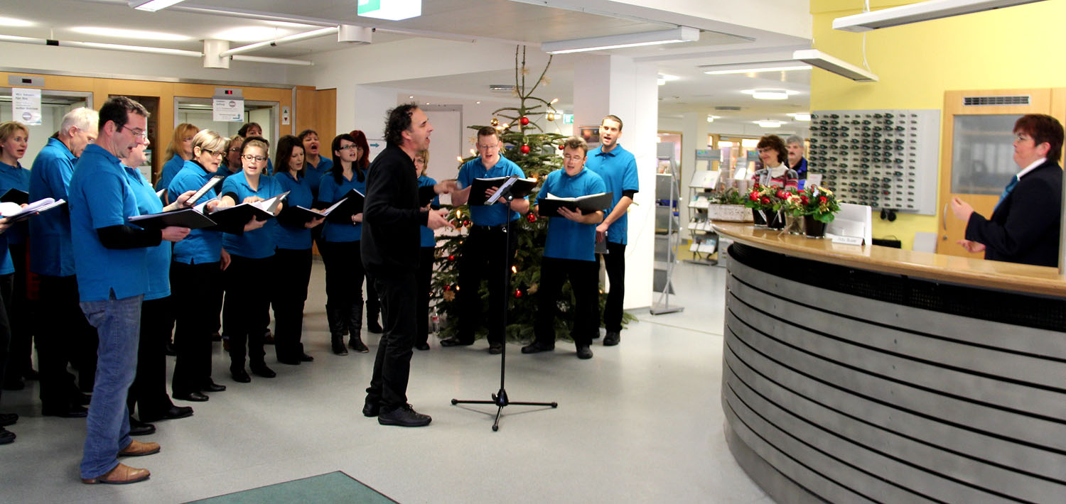 Die Gruppe Sing´n´Swing besucht die Main-Kinzig-Kliniken zum dritten Mal, um den Patienten und dem dortigen Personal in der Adventszeit mit Liedern aus ihrem reichhaltigen Repertoire Freude zu bereiten und Trost zu spenden. Nach dem Einsingen in der Krankenhauskapelle machten sich die Aktiven mit dem Chorleiter Peter Grimm auf den Weg zu ihren Zuhörern. Die Auftritte gehören schon zur Pflichtübung dieser Gruppe. Chorleiter Peter Grimm traf die Auswahl der Chorliteratur und ging hoch motiviert mit den Aktiven zu Werke.
