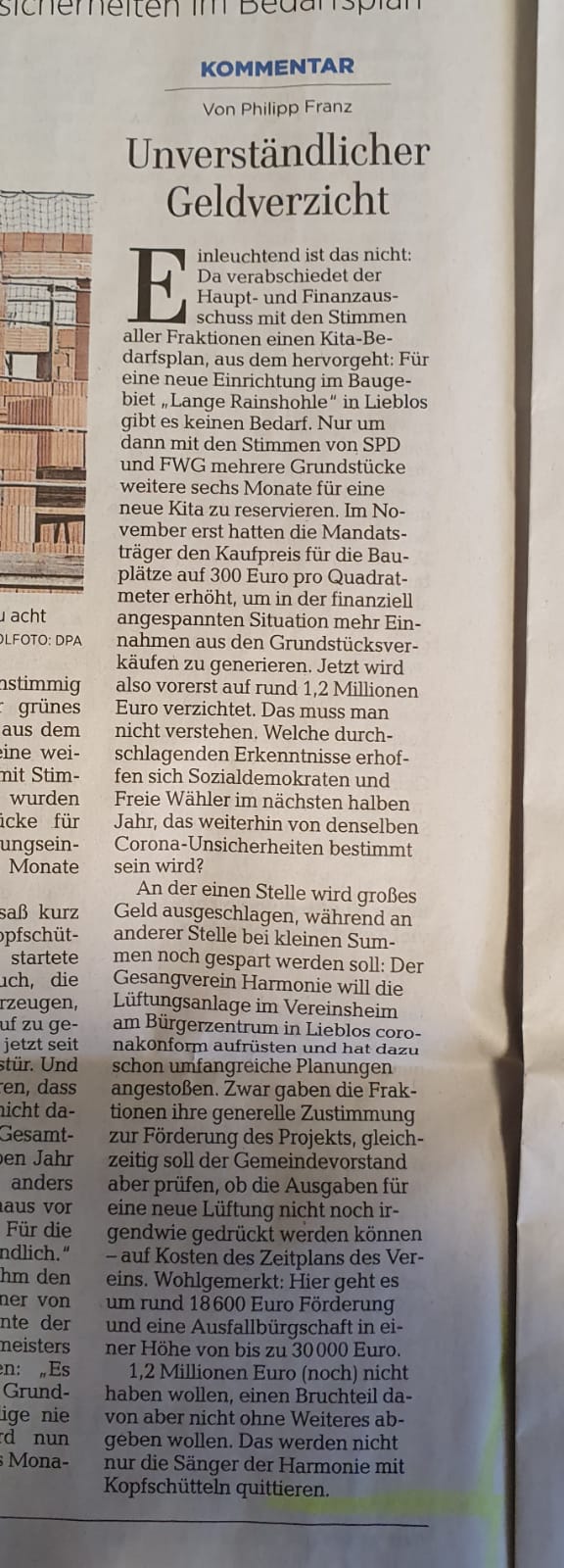 Zeitungsartikel GNZ zur Sitzung Haupt- und Finanzausschuß Gem. Gründau 25.01.2021 - Lüftungsanlage Harmonie